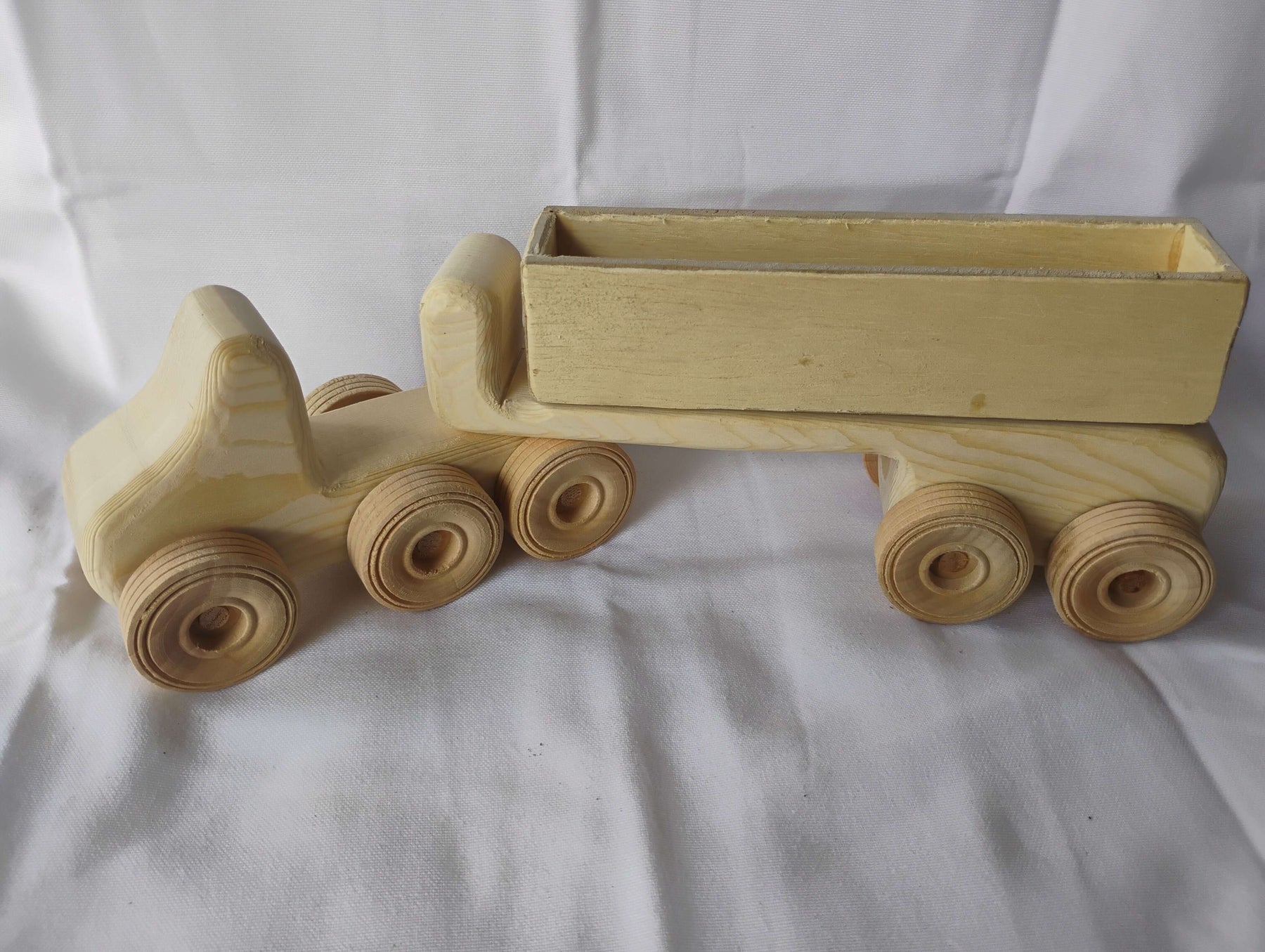 This is a Transfer Truck and Trailer with a Box Attachment handmade from 100% wood. The Truck and Trailer are heavy duty type of pine and axles and wheels are hardwood. The Box Attachment is removable for changing out to another Attachment. This set is made so it will last for years to come.