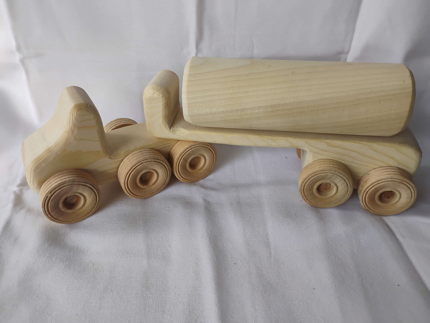 This is a Transfer Truck and Trailer with a Tanker Attachment handmade from 100% wood. The Truck,  Trailer, and Tanker Attachment are heavy duty type of pine and axles and wheels are hardwood. The Tanker Attachment is removable for changing out to another Attachment. This set is made so it will last for years to come.